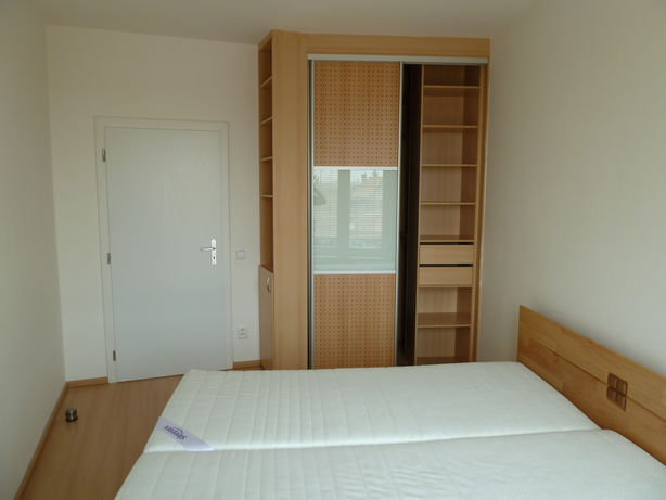 Do útulné světlé ložnice (14 m2) se pohodlně vejde dvoulůžko a v případě potřeby i pracovní stůl pro práci z domova. Část ložnice je zařízena jako uzavíratelná šatna s prostorem pro uložení oblečení a osobních věcí uživatelů bytu, jakož i úklidových prostředků.